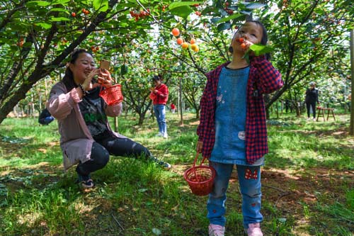 4月27日,游客在泗安鎮(zhèn)毛家村的櫻桃園內(nèi)采摘櫻桃。毛家村種植了2000多畝櫻桃,預(yù)計(jì)今年每個(gè)櫻桃種植戶人均可增收9000元左右。