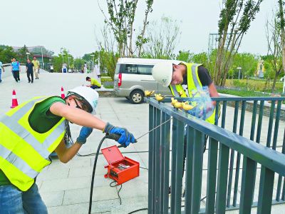 上午9時(shí),安裝工作正在進(jìn)行,大約20只“小金鳥(niǎo)”陸續(xù)進(jìn)入最后的焊接階段。現(xiàn)場(chǎng)施工負(fù)責(zé)人郭中戌師傅告訴記者,“和原來(lái)那批相比,小鳥(niǎo)的牢固程度增加了三倍以上?!庇浾呖吹剑X制鳥(niǎo)身下方連接著一個(gè)長(zhǎng)而細(xì)的不銹鋼管,鋼管穿透護(hù)欄,欄桿上方的部分噴膠,欄桿下邊的部分?jǐn)Q緊螺絲后再加一層焊接。