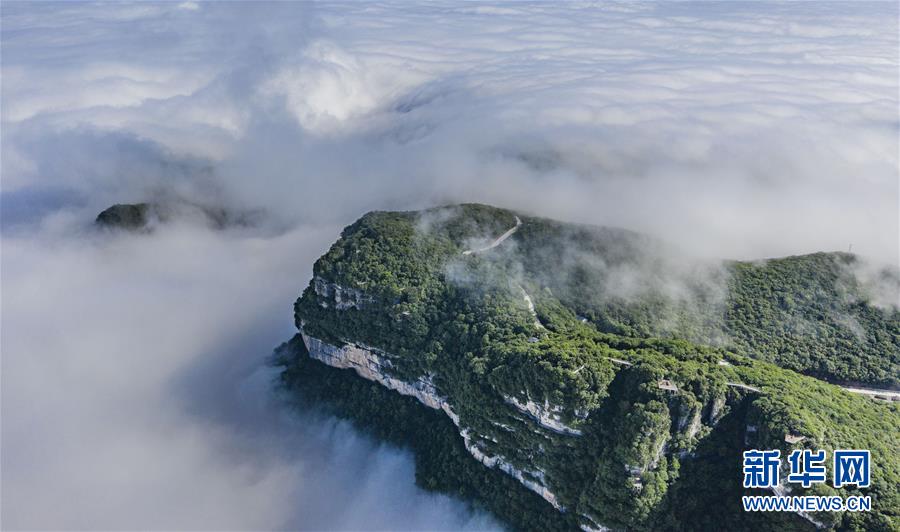 6月10日拍攝的漢中市南鄭區(qū)龍頭山景區(qū)的云海景觀(無人機(jī)照片)。 新華社記者 陶明 攝