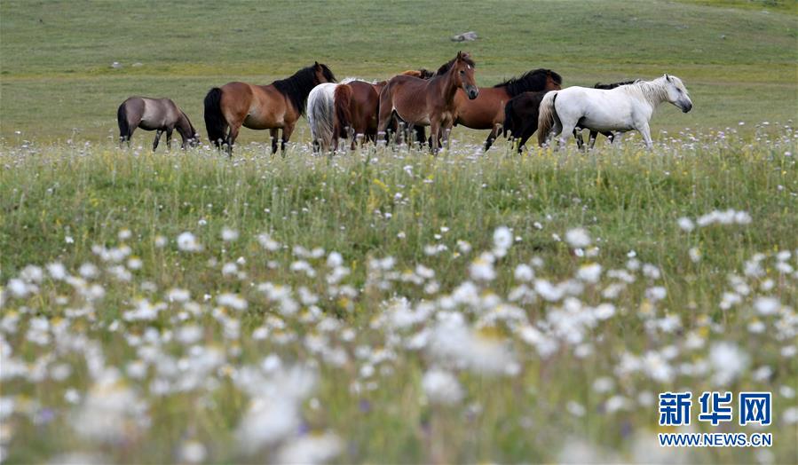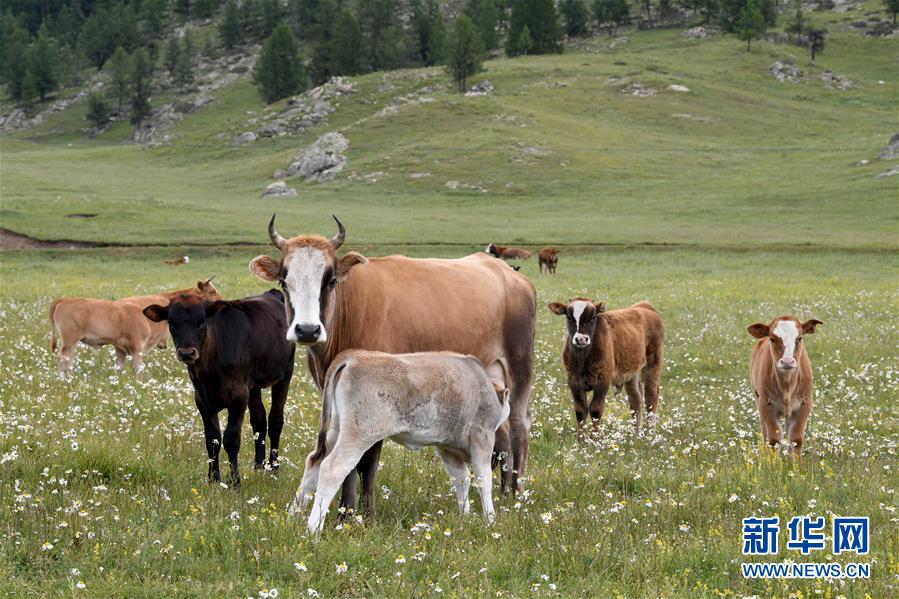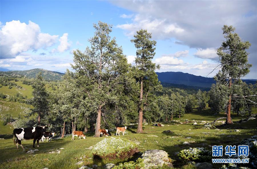 這是6月21日拍攝的新疆阿勒泰地區(qū)哈巴河縣的牧場風(fēng)光。新華社記者 沙達(dá)提 攝