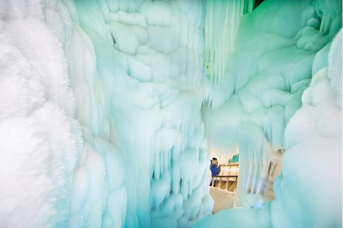 洞外鮮花盛開,綠樹成蔭,洞內(nèi)卻寒氣逼人。目前,洞內(nèi)已開發(fā)部分分為三層,有冰簾、冰鐘、冰花、冰人、冰菩薩等,堪稱一個冰的世界,在五彩燈光的照射下,呈現(xiàn)出夢幻般的景象,被稱為世界奇觀。