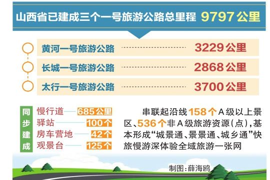 截至今年10月10日,山西省已建成三個(gè)一號(hào)旅游公路總里程9797公里。其中,黃河一號(hào)旅游公路3229公里、長(zhǎng)城一號(hào)旅游公路2868公里、太行一號(hào)旅游公路3700公里,同步建成慢行道685公里、驛站100個(gè)、房車(chē)營(yíng)地42個(gè)、觀(guān)景臺(tái)125個(gè),串聯(lián)起沿線(xiàn)158個(gè)A級(jí)以上景區(qū)、536個(gè)非A級(jí)旅游資源(點(diǎn)),基本形成“城景通、景景通、城鄉(xiāng)通”快旅慢游深體驗(yàn)全域旅游一張網(wǎng)。