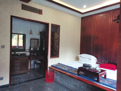 這里的房間比一般客棧寬敞許多,而且每間房都風(fēng)格迥異,比如有的床頭是充滿意境的書(shū)畫(huà),有的床頭是雕刻花紋的木板,有的多了古典桌椅,有的放置了茶幾,有的則多了沙發(fā)、屏風(fēng)或條幾、膽瓶……每間房都融合了寧?kù)o與古樸的元素,屋子里擺放的瓷壇和衣柜等老物件寫(xiě)滿歲月的痕跡。