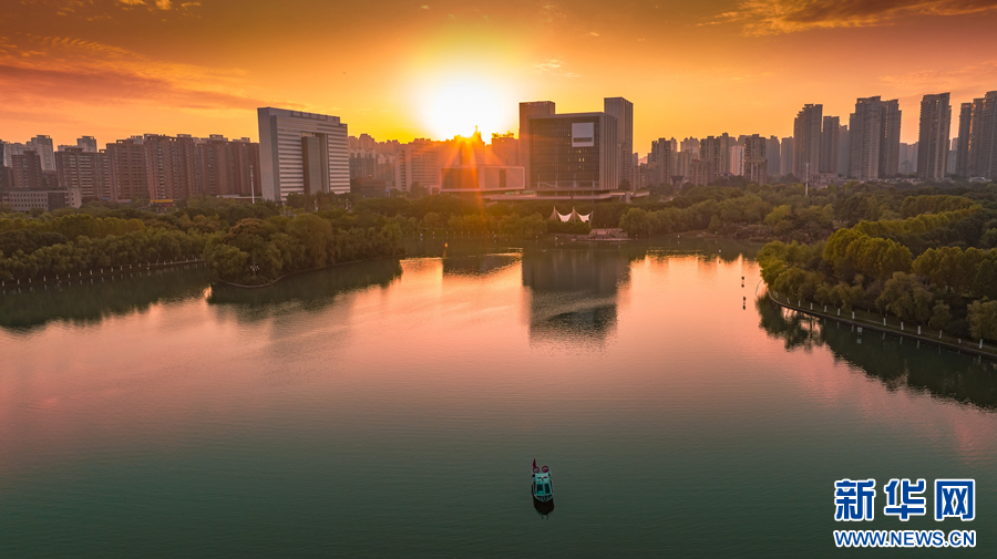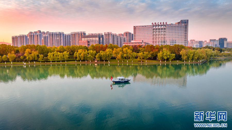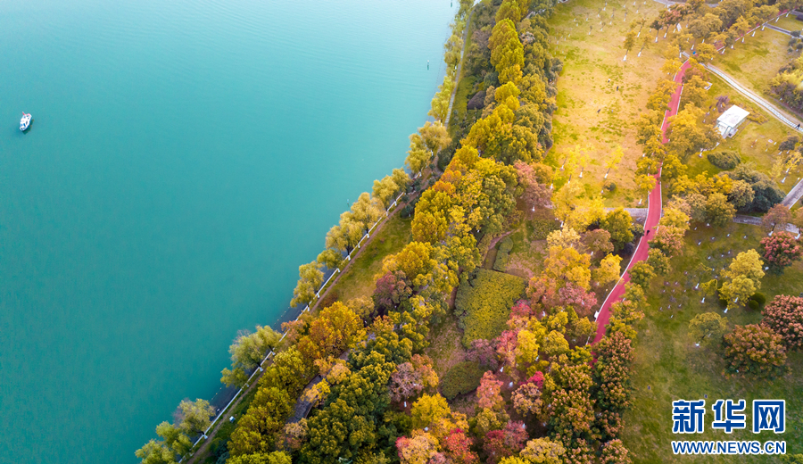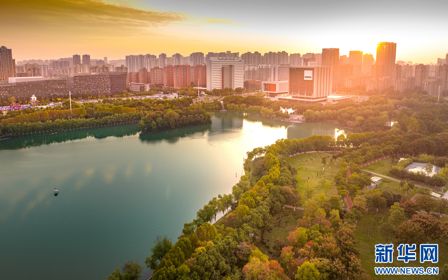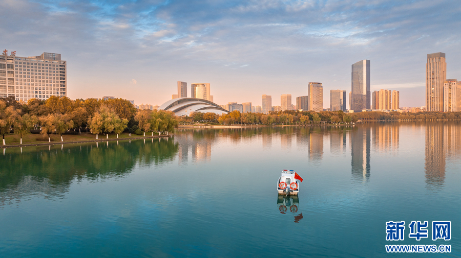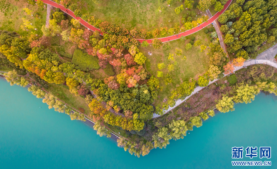 近日,在安徽省合肥市政務(wù)區(qū)天鵝湖畔,層林盡染,景色旖旎。周圍的樹(shù)木、建筑物,與清澈的湖水交相輝映,渲染成一幅色彩斑斕的迷人畫卷。新華網(wǎng)發(fā)(劉玉才 攝)