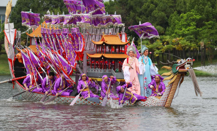 新華社上海6月10日電(記者陳愛平、許曉青)隨著立竿、出龍、點睛、接龍、送標、旺盆等儀式完成,68歲的張亭源老人身著金黃色底、繡有青龍圖案的衣裳,健步登上五彩龍船。平底、昂首、翹尾的龍船在上海寶山美蘭湖面靈活行駛、快速轉彎,隊員們齊聲呼號,戲曲演員立于船頭,彩旗在風中飄揚,引得現(xiàn)場觀眾連連叫好。