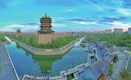 環(huán)繞古城的大同城墻帶狀公園護(hù)城河。