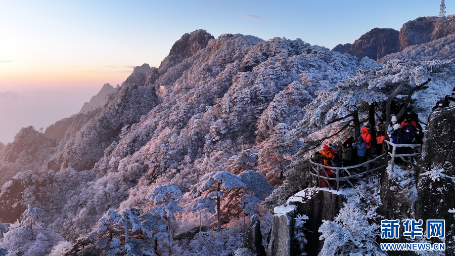 近日,安徽黃山雪后初霽,山峰銀裝素裹,滿目玉樹瓊枝。云霧如同舞者般在白雪皚皚的峰巒間穿梭嬉戲,宛如一幅渾然天成的水墨丹青。