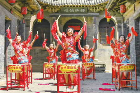 ②4月28日,太谷區(qū)文化館親疙蛋鼓舞隊(duì)隊(duì)員正在三多堂景區(qū)排練,為即將到來(lái)的“五一”假期展演做準(zhǔn)備。