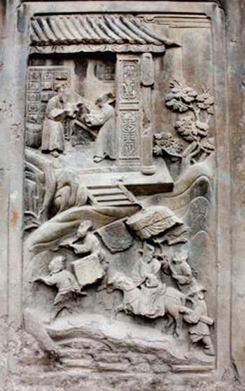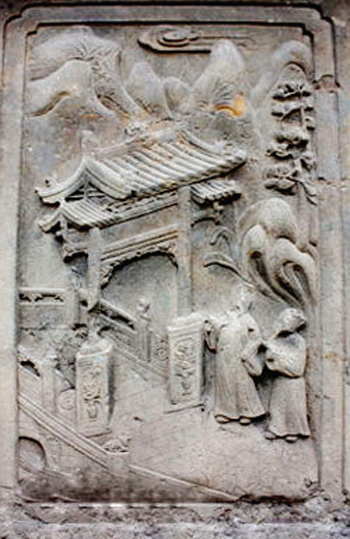 配坊實際上是一座功名石牌坊,上面刊載著武訪疇一家四代人的姓名及朝廷贈封的官爵,咸豐六年(1856)由武訪疇修建。這座石雕牌坊與其它牌坊最大的區(qū)別就是沒有題刻坊名,因此只能稱之為配坊。坐北向南,為四柱三間三樓單檐歇山頂結(jié)構,牌樓高8米,寬12米,坊體坐落在近1米高的長方形臺基上,立柱仍然采用夾柱石固定。坊頂覆蓋青瓦,正脊飾石雕貔貅裝飾,飛檐翹角,明樓檐下為“圣旨”牌,當心間設兩層小字板,第一層題刻:“贈資政大夫曾祖父廷桂,贈夫人曾祖母李氏;誥贈資政大夫祖父秉壁,誥贈夫人祖母吳氏;誥贈資政大夫父烈,誥封夫人母朱氏。陜西分巡延榆綏兵備道、加四級武訪疇謹建?!钡诙宇}刻“大清咸豐六年歲次丙辰仲夏上院榖旦”。武訪疇借建坊要弘揚祖輩陰德,而祖輩的姓氏大名又不能題刻在母親的節(jié)孝牌坊上,所以,他必須另建一坊才能完整地表達心愿。實際上,這就是建造配坊的真正目的。也正因此在配坊題刻“龍光錫寵”、“鳳詔褒榮”、“克成先志”、“重裕后昆”等。