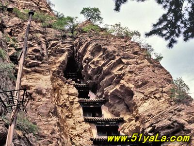 北洞是主體建筑部分。中區(qū)有大殿三間,座北向南。原為道教三清塑像,后被佛教改成三世佛。左右耳殿,另有東西配殿各三間,南閣一間。東側(cè)迎面山壁上,自然形成龐大的三角形石縫,內(nèi)有天然石洞,景觀奇特。石縫上端,外建五層樓閣。依崖開鑿卯洞,梁架結(jié)構(gòu)與崖石交接構(gòu)筑,建造精巧。閣內(nèi)設(shè)有鐵索,扶鐵索可攀援而上。在閣的東邊又有一洞,內(nèi)建殿三間,名九仙女閣,塑九仙女像。箭閣外塑趙杲泥像,頭頂距石崖僅二指半,故舊稱“趙杲觀,離天二指半”。再往南,就是趙杲觀最險峻的景觀了。峭峰高處,半山腰中,山洞前面,建樓三間。一眼望去,高閣懸空,上峭崖,下絕壁,左右山石如刀削。上下左右根本無路可通。山洞中垂下一條長約20米的鐵索,成了進洞的唯一途徑。只有勇敢的虔誠者或探險者,方可垂直攀索而登,一般人只能望樓興嘆,故鐵索被譽為“仙閣云梯”。三層樓建筑后依山洞,前為磚木結(jié)構(gòu)。上層內(nèi)塑太上老君、無始天尊、通天教主。中層內(nèi)塑關(guān)圣帝君。下層供修持者居住。當(dāng)時修筑情景,真令人難以想像。北洞群落,地形險要,峰巒競秀,古木參天,峭峻幽邃,設(shè)計大膽,造型奇特。人夸“雁北懸空寺,不及代州趙杲現(xiàn)”說的并不過分。