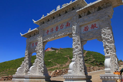 五臺山的南臺名喚錦繡峰,又名仙花山,海拔2485米。整個山勢像一匹駿馬靜臥群山之中。山峰聳峭,孤立挺拔,如果說其他四個臺是連襟而立或裙帶關(guān)系的話,南臺則是貌美如花、孤傲冷峻的公主?!肚鍥錾街尽访枋觯骸吧椒迓柷停瑹煿饽?,細草雜花,千巒彌布,猶鋪錦然,故以名焉”。山頂寺院叫普濟寺,內(nèi)供智慧文殊。