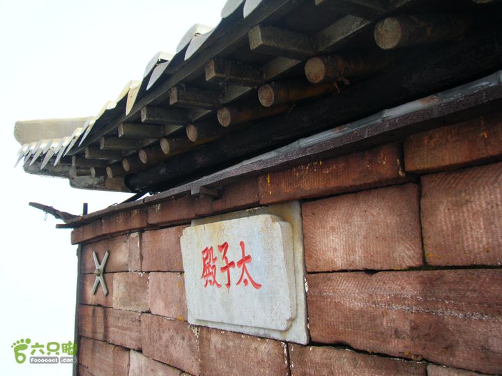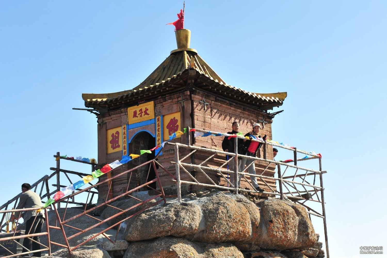 蘆芽山主峰絕頂周方僅約10平方米的石坪上,巍然托起一座正方體狀石砌建筑,這便是太子殿。三面懸崖,甚為險峻。因其位居群山之極,數(shù)十里外即可看到。太子殿為石壁構筑,殿脊有一鐵棍直指蒼穹,似為避雷特置。殿頂向四面披散,原以銅瓦鋪蓋,今已遺失。殿門北向而開,門據有石鑿“太子殿”三字赫然醒目。兩側墻壁又鑿“佛祖”二字,工整雄勁。殿門兩側石刻聯(lián)語系光緒年間白文良倡修該殿時書鑿,句為:復慈云于中國,性潔雨于邊方。著名書法家黃克毅有詩贊太子殿景致: