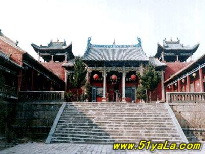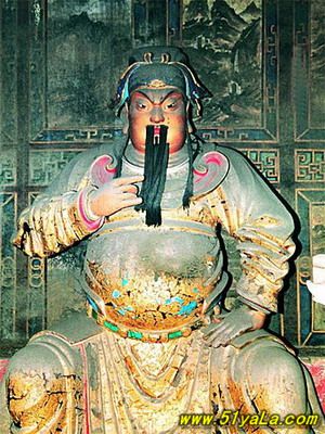 前行有午門(mén).是一座面闊五間,單檐廡殿頂、石雕回廊的廳式建筑。周?chē)惺瘷跅U,欄板正反兩面浮雕各類(lèi)圖案、人物144幅,洋洋大觀,頗有童趣。廳內(nèi)南有周倉(cāng)、廖化畫(huà)像,軒昂威武。北面左右兩側(cè),彩繪著關(guān)羽戎馬一生的主要經(jīng)歷,起于桃園三結(jié)義,止于水淹七軍,只是沒(méi)有走麥城這個(gè)情節(jié),在全國(guó)關(guān)廟壁畫(huà)中都按此進(jìn)行,據(jù)說(shuō)這是因忌諱關(guān)羽自高自大而被殺,終于造成蜀國(guó)的覆滅而隱去的。穿過(guò)午門(mén),經(jīng)“山海鐘靈”坊、御書(shū)樓,便是關(guān)帝廟主體建筑崇寧殿。