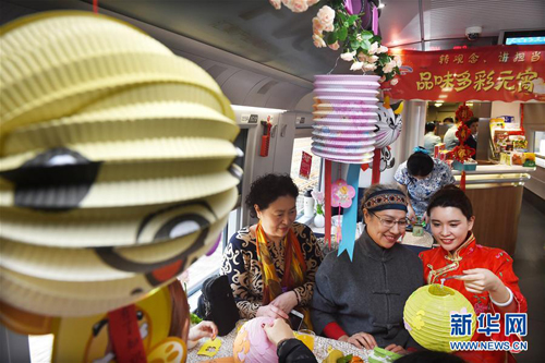 當(dāng)日,中國(guó)鐵路濟(jì)南局集團(tuán)有限公司在部分列車上開展“品味多彩元宵共享幸福旅程”活動(dòng),舉行猜燈謎、品元宵、展茶藝、做花燈等活動(dòng),邀請(qǐng)旅客共同參與。 新華社記者 李紫恒攝