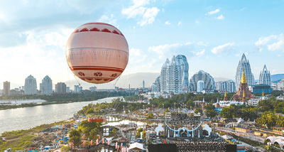 游客在云南省景洪市體驗告莊西雙景氦氣球,領略西雙版納的迷人風光。