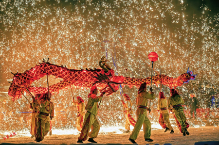 除了誘人的美食,精彩演藝必不可少。“新春巡游”的絢麗花車流光溢彩,演員們身著精致華麗的服飾載歌載舞,與游客熱情互動(dòng)。限定非遺“祈福花火秀”更是帶來一場(chǎng)視覺盛宴,“鐵樹銀花落,萬點(diǎn)星辰開”,火龍鋼花與落花秀相互交融,鐵火流星漫天飛舞,一起感受跨越千年的祝福與熾熱。還有“鬧新春”主題晚會(huì),歌舞、雜技輪番上演。廣大游客還可在歡聲笑語中圍著篝火牽手狂歡,共度闔家團(tuán)圓的美好時(shí)光。