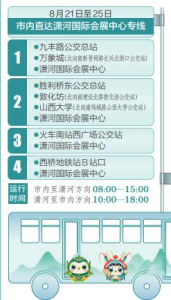 太原市將在山西文博會(huì)期間開(kāi)通5條免費(fèi)公交接駁專(zhuān)線(xiàn)。其中,4條市內(nèi)直達(dá)瀟河國(guó)際會(huì)展中心的專(zhuān)線(xiàn),分別從九豐路公交總站—萬(wàn)象城(北向南新晉祠路長(zhǎng)興北街口公交站)—瀟河國(guó)際會(huì)展中心;勝利橋東公交總站—敦化坊(北向南建設(shè)北路敦化坊公交站)—山西大學(xué)(北向南塢城路山西大學(xué)公交站)—瀟河國(guó)際會(huì)展中心;火車(chē)南站西廣場(chǎng)公交站—瀟河國(guó)際會(huì)展中心;西橋地鐵站B站口—瀟河國(guó)際會(huì)展中心。運(yùn)行時(shí)間為市內(nèi)至瀟河方向8:00—15:00,瀟河至市內(nèi)方向10:00—18:00。此外,為便于駕車(chē)自行前往的市民出行,還開(kāi)通了1條社會(huì)停車(chē)場(chǎng)至山西瀟河國(guó)際會(huì)展中心的免費(fèi)接駁線(xiàn)路。該線(xiàn)路從先行路瀟河大街口經(jīng)先行路至?xí)怪行耐颠\(yùn)行,在智慧南街口、先行路樂(lè)商街口停靠,運(yùn)行時(shí)間為9:00—18:00。