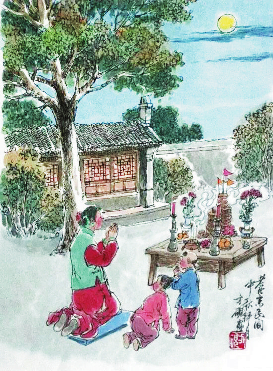 “中秋月。月到中秋偏皎潔?!辟p月是中秋節(jié)的重要習俗,我國民間的中秋賞月活動約始于魏晉時期,盛于唐朝,當時許多名篇佳作中都有詠月的詩句。北宋時期,以賞月活動為中心的中秋節(jié)已成為普遍的民俗節(jié)日,然而與唐代不同的是,宋代關于賞月的作品多是感物傷懷,以陰晴圓缺喻人情世態(tài)。宋代的中秋夜是不眠之夜,夜市通宵營業(yè),游人絡繹不絕,《東京夢華錄》中載:“中秋節(jié)前,諸店皆賣新酒,貴家結飾臺榭,民家爭占酒樓玩月,笙歌遠聞千里,嬉戲連坐至曉。”一些地方甚至流傳“中秋夜越晚睡越長壽”的說法,于是有了守夜的習俗。守夜時,家里長輩通常會給小孩講關于月亮的故事,如嫦娥奔月、吳剛伐桂等,孩子們個個聽得津津有味。