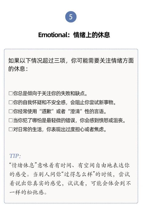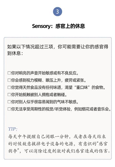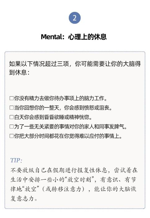 人們對(duì)于休息有不同層面的需要,休息與每一天的生活息息相關(guān)。單靠某一個(gè)具體的假期、某一種具體的活動(dòng)(社交或者睡覺(jué)),并不能讓我們恢復(fù)到完全休息好了的狀態(tài)。