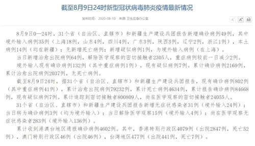 情況顯示,截至8月9日24時,據(jù)31個?。ㄗ灾螀^(qū)、直轄市)和新疆生產(chǎn)建設(shè)兵團報告,現(xiàn)有確診病例802例(其中重癥病例41例),累計治愈出院病例79232例,累計死亡病例4634例,累計報告確診病例84668例,現(xiàn)有疑似病例7例。累計追蹤到密切接觸者800809人,尚在醫(yī)學(xué)觀察的密切接觸者24055人。
