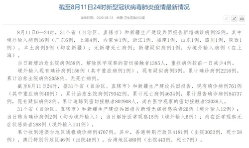人民網(wǎng)北京8月12日電(董童)國(guó)家衛(wèi)生健康委于今日在官網(wǎng)發(fā)布的《截至8月11日24時(shí)新型冠狀病毒肺炎疫情最新情況》(以下簡(jiǎn)稱“情況”)提出,8月11日0—24時(shí),31個(gè)省(自治區(qū)、直轄市)和新疆生產(chǎn)建設(shè)兵團(tuán)報(bào)告新增確診病例25例,其中境外輸入病例16例(廣東6例,上海4例,內(nèi)蒙古1例,浙江1例,福建1例,山東1例,四川1例,陜西1例),本土病例9例(均在新疆);無(wú)新增死亡病例;新增疑似病例1例,為境外輸入病例(在上海)。當(dāng)日新增治愈出院病例58例,解除醫(yī)學(xué)觀察的密切接觸者1385人,重癥病例較前一日減少4例。