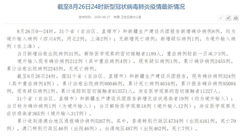 人民網(wǎng)北京8月27日電(董童)國家衛(wèi)生健康委于今日在官網(wǎng)發(fā)布的《截至8月26日24時新型冠狀病毒肺炎疫情最新情況》(以下簡稱“情況”)提出,8月26日0—24時,31個?。ㄗ灾螀^(qū)、直轄市)和新疆生產(chǎn)建設(shè)兵團報告新增確診病例8例,均為境外輸入病例(四川4例,河北2例,上海2例);無新增死亡病例;新增疑似病例1例,為境外輸入病例(在上海)。當日新增治愈出院病例31例,解除醫(yī)學(xué)觀察的密切接觸者1189人,重癥病例較前一日減少3例。