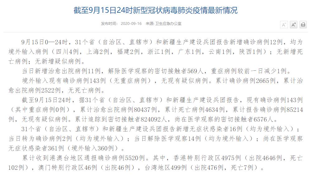 情況顯示,截至9月15日24時(shí),據(jù)31個(gè)?。ㄗ灾螀^(qū)、直轄市)和新疆生產(chǎn)建設(shè)兵團(tuán)報(bào)告,現(xiàn)有確診病例143例(其中重癥病例0例),累計(jì)治愈出院病例80437例,累計(jì)死亡病例4634例,累計(jì)報(bào)告確診病例85214例,無現(xiàn)有疑似病例。累計(jì)追蹤到密切接觸者824092人,尚在醫(yī)學(xué)觀察的密切接觸者6576人。