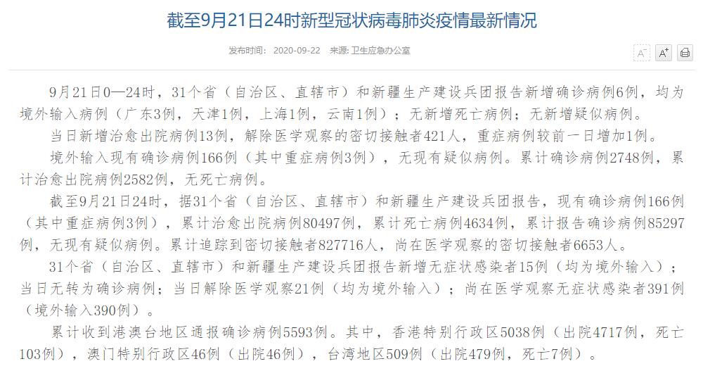 情況顯示,截至9月21日24時,據(jù)31個?。ㄗ灾螀^(qū)、直轄市)和新疆生產(chǎn)建設(shè)兵團(tuán)報告,現(xiàn)有確診病例166例(其中重癥病例3例),累計治愈出院病例80497例,累計死亡病例4634例,累計報告確診病例85297例,無現(xiàn)有疑似病例。累計追蹤到密切接觸者827716人,尚在醫(yī)學(xué)觀察的密切接觸者6653人。