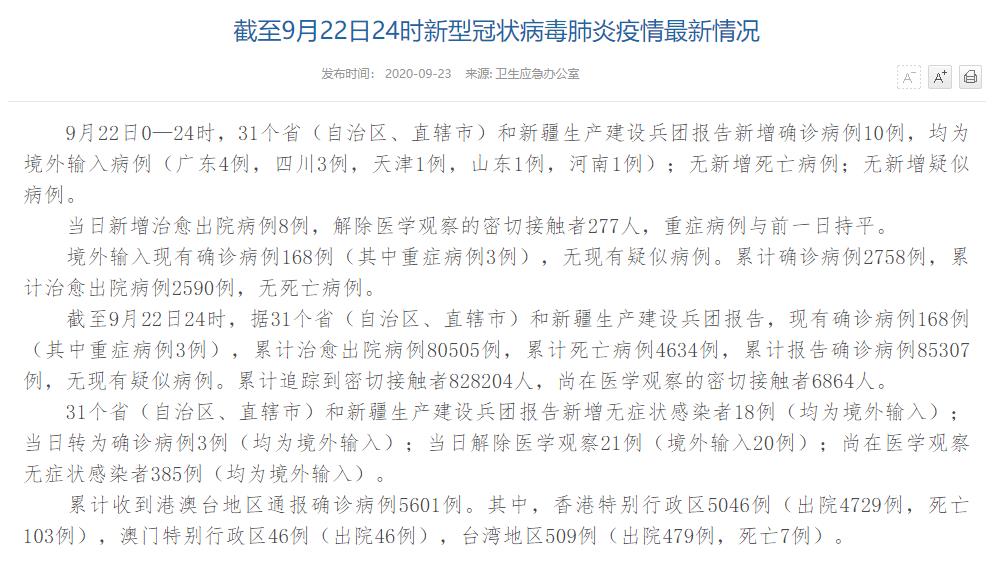 人民網(wǎng)北京9月23日電(董童)國家衛(wèi)生健康委于今日在官網(wǎng)發(fā)布的《截至9月22日24時新型冠狀病毒肺炎疫情最新情況》(以下簡稱“情況”)提出,9月22日0—24時,31個?。ㄗ灾螀^(qū)、直轄市)和新疆生產(chǎn)建設(shè)兵團(tuán)報告新增確診病例10例,均為境外輸入病例(廣東4例,四川3例,天津1例,山東1例,河南1例);無新增死亡病例;無新增疑似病例。當(dāng)日新增治愈出院病例8例,解除醫(yī)學(xué)觀察的密切接觸者277人,重癥病例與前一日持平。