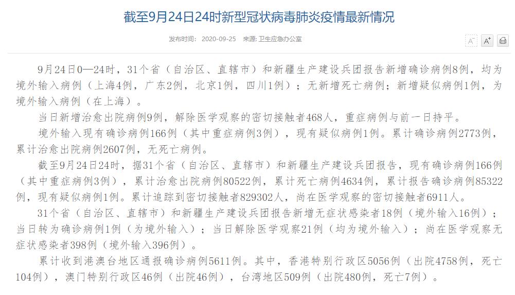 人民網(wǎng)北京9月25日電(董童)國家衛(wèi)生健康委于今日在官網(wǎng)發(fā)布的《截至9月24日24時新型冠狀病毒肺炎疫情最新情況》(以下簡稱“情況”)顯示,9月24日0—24時,31個?。ㄗ灾螀^(qū)、直轄市)和新疆生產(chǎn)建設(shè)兵團(tuán)報告新增確診病例8例,均為境外輸入病例(上海4例,廣東2例,北京1例,四川1例);無新增死亡病例;新增疑似病例1例,為境外輸入病例(在上海)。當(dāng)日新增治愈出院病例9例,解除醫(yī)學(xué)觀察的密切接觸者468人,重癥病例與前一日持平。