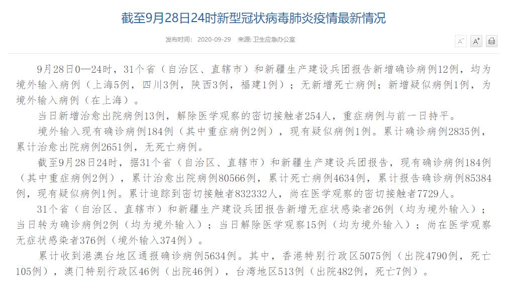 情況顯示,截至9月28日24時(shí),據(jù)31個(gè)?。ㄗ灾螀^(qū)、直轄市)和新疆生產(chǎn)建設(shè)兵團(tuán)報(bào)告,現(xiàn)有確診病例184例(其中重癥病例2例),累計(jì)治愈出院病例80566例,累計(jì)死亡病例4634例,累計(jì)報(bào)告確診病例85384例,現(xiàn)有疑似病例1例。累計(jì)追蹤到密切接觸者832332人,尚在醫(yī)學(xué)觀察的密切接觸者7729人。
