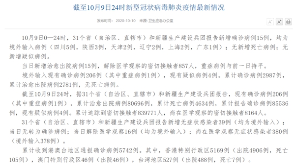 人民網(wǎng)北京10月10日電(許曉華)國(guó)家衛(wèi)生健康委于今日在官網(wǎng)發(fā)布的《截至10月9日24時(shí)新型冠狀病毒肺炎疫情最新情況》(以下簡(jiǎn)稱“情況”)提出,10月9日0—24時(shí),31個(gè)?。ㄗ灾螀^(qū)、直轄市)和新疆生產(chǎn)建設(shè)兵團(tuán)報(bào)告新增確診病例15例,均為境外輸入病例(四川5例,陜西3例,天津2例,遼寧2例,上海2例,廣東1例);無(wú)新增死亡病例;無(wú)新增疑似病例。當(dāng)日新增治愈出院病例15例,解除醫(yī)學(xué)觀察的密切接觸者857人,重癥病例與前一日持平。