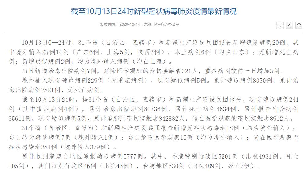 人民網(wǎng)北京10月14日電(董童)國家衛(wèi)生健康委于今日在官網(wǎng)發(fā)布的《截至10月13日24時(shí)新型冠狀病毒肺炎疫情最新情況》(以下簡(jiǎn)稱“情況”)稱,10月13日0—24時(shí),31個(gè)?。ㄗ灾螀^(qū)、直轄市)和新疆生產(chǎn)建設(shè)兵團(tuán)報(bào)告新增確診病例20例,其中境外輸入病例14例(廣東6例,上海5例,陜西3例),本土病例6例(均在山東);無新增死亡病例;新增疑似病例2例,均為境外輸入病例(均在上海)。當(dāng)日新增治愈出院病例7例,解除醫(yī)學(xué)觀察的密切接觸者321人,重癥病例較前一日增加3例。