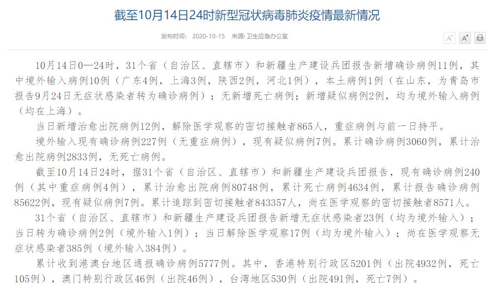 人民網(wǎng)北京10月15日電(董童)國家衛(wèi)生健康委于今日在官網(wǎng)發(fā)布的《截至10月14日24時新型冠狀病毒肺炎疫情最新情況》(以下簡稱“情況”)提出,10月14日0—24時,31個省(自治區(qū)、直轄市)和新疆生產(chǎn)建設(shè)兵團(tuán)報(bào)告新增確診病例11例,其中境外輸入病例10例(廣東4例,上海3例,陜西2例,河北1例),本土病例1例(在山東,為青島市報(bào)告9月24日無癥狀感染者轉(zhuǎn)為確診病例);無新增死亡病例;新增疑似病例2例,均為境外輸入病例(均在上海)。當(dāng)日新增治愈出院病例12例,解除醫(yī)學(xué)觀察的密切接觸者865人,重癥病例與前一日持平。