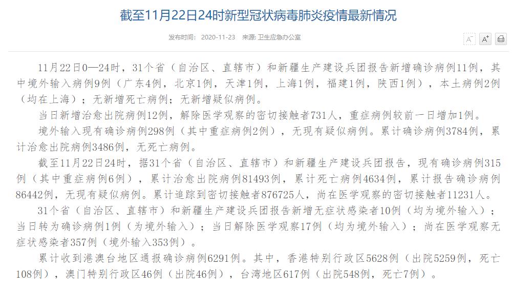 情況顯示,截至11月22日24時,據(jù)31個省(自治區(qū)、直轄市)和新疆生產(chǎn)建設(shè)兵團(tuán)報告,現(xiàn)有確診病例315例(其中重癥病例6例),累計治愈出院病例81493例,累計死亡病例4634例,累計報告確診病例86442例,無現(xiàn)有疑似病例。累計追蹤到密切接觸者876725人,尚在醫(yī)學(xué)觀察的密切接觸者11231人。