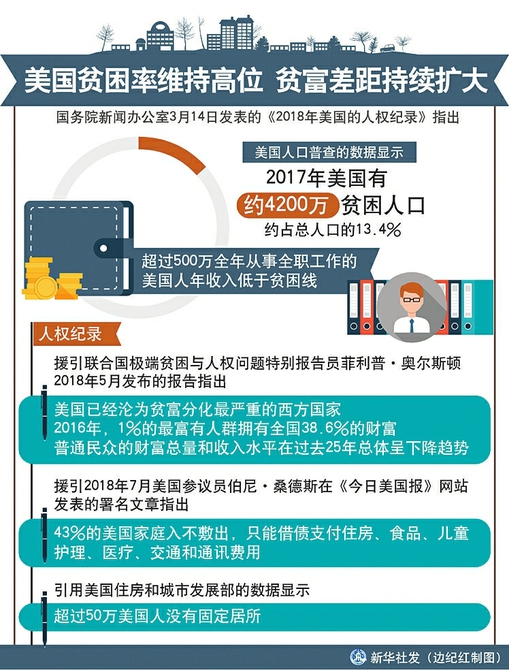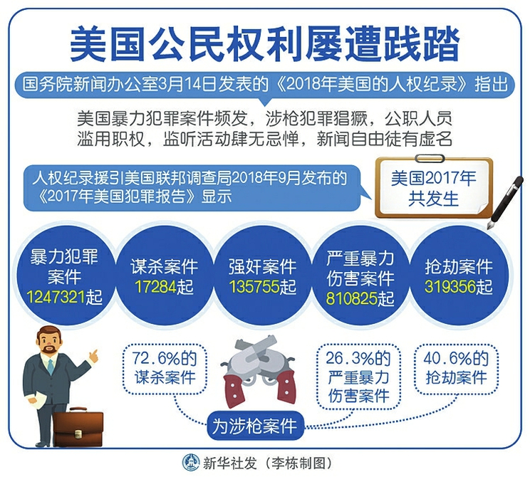 國務(wù)院新聞辦公室14日發(fā)表《2018年美國的人權(quán)紀錄》《2018年美國侵犯人權(quán)事記》,對美國侵犯人權(quán)的狀況進行揭露。