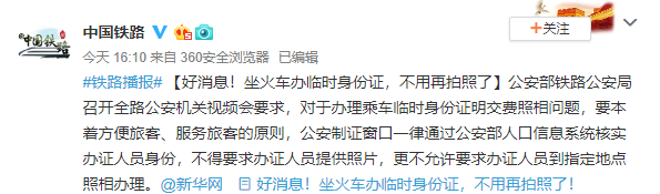 人民網(wǎng)北京5月8日電 據(jù)中國鐵路總公司官方微博消息,公安部鐵路公安局召開全路公安機(jī)關(guān)視頻會要求,對于辦理乘車臨時(shí)身份證明交費(fèi)照相問題,要本著方便旅客、服務(wù)旅客的原則,公安制證窗口一律通過公安部人口信息系統(tǒng)核實(shí)辦證人員身份,不得要求辦證人員提供照片,更不允許要求辦證人員到指定地點(diǎn)照相辦理。