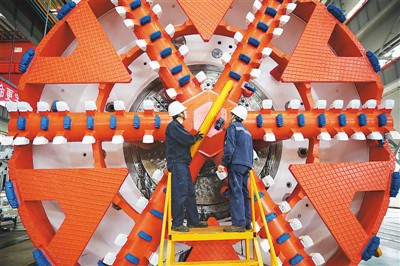 今年以來,濟(jì)南重工集團(tuán)有限公司打造以軌道交通裝備產(chǎn)業(yè)為核心的智能制造與高端裝備產(chǎn)業(yè)園,重點(diǎn)發(fā)展全斷面隧道掘進(jìn)機(jī)、隧道掘進(jìn)專用裝備、裝配式建材生產(chǎn)線等產(chǎn)品領(lǐng)域,老國企煥發(fā)出勃勃生機(jī)。圖為工人在查看即將完工的盾構(gòu)機(jī)刀盤。