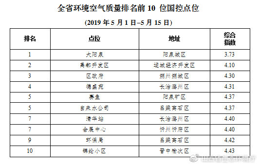環(huán)境空氣質(zhì)量較好的前10個點位(從第1名至第10名)依次為:陽泉城區(qū)大陽泉點位、運城經(jīng)濟開發(fā)區(qū)禹都開發(fā)區(qū)點位、朔州朔城區(qū)區(qū)政府點位、長治潞州區(qū)德盛苑點位、陽泉礦區(qū)賽魚點位和呂梁離石區(qū)自來水公司點位(并列第5)、長治潞州區(qū)清華站點位和忻州忻府區(qū)會展中心點位(并列第7)、呂梁離石區(qū)環(huán)保局點位、晉中榆次區(qū)錦綸小區(qū)點位。