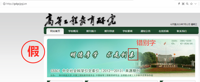 有的仿冒網(wǎng)站內(nèi)容粗糙、錯(cuò)誤明顯,如期刊《高等工程教育研究》的仿冒網(wǎng)站將“求是創(chuàng)新”錯(cuò)寫為“求是創(chuàng)親”。