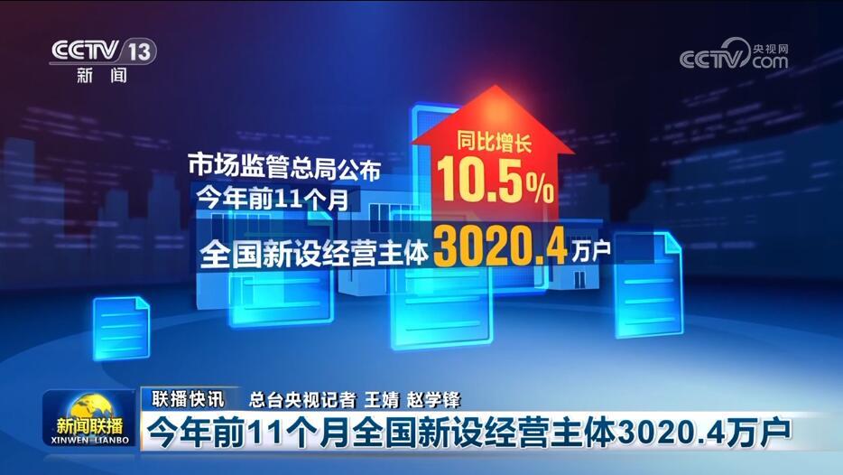 今年前11個月全國新設經(jīng)營主體3020.4萬戶