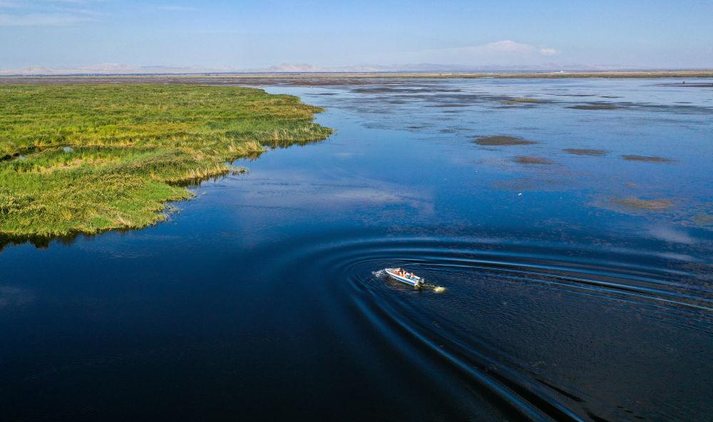 9月15日,在內(nèi)蒙古烏梁素海湖面上,河湖濕地水環(huán)境保護(hù)與修復(fù)技術(shù)研究團(tuán)隊(duì)成員乘坐快艇去采集湖水樣本(無(wú)人機(jī)照片)。新華社記者 連振 攝
