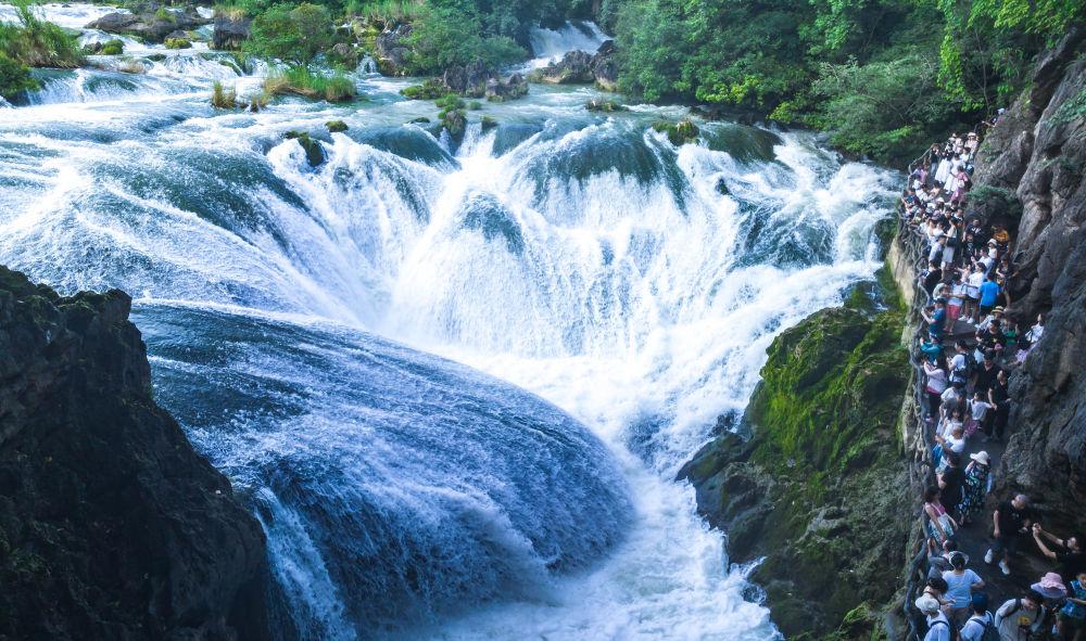 8月16日,游客在貴州省安順市黃果樹瀑布景區(qū)游覽(無(wú)人機(jī)照片)。