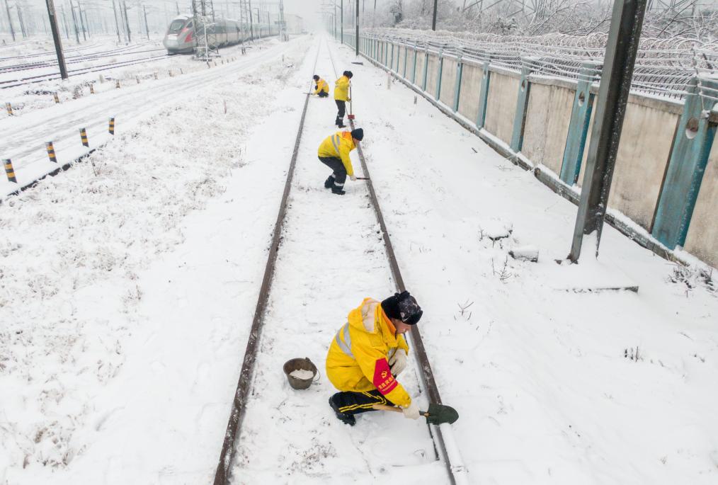 2月4日,武漢高鐵工務(wù)段工人在清掃軌道上的冰雪(無人機(jī)照片)。新華社記者 杜子璇 攝