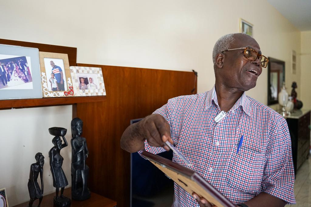 在安哥拉首都羅安達(dá)凱蘭巴新城,加斯帕·佩德羅在家中向記者展示照片。