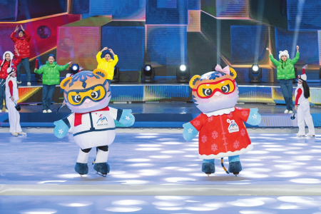 圖為第九屆亞洲冬季運動會吉祥物“濱濱”(前左)、“妮妮”(前右)在活動現(xiàn)場表演。