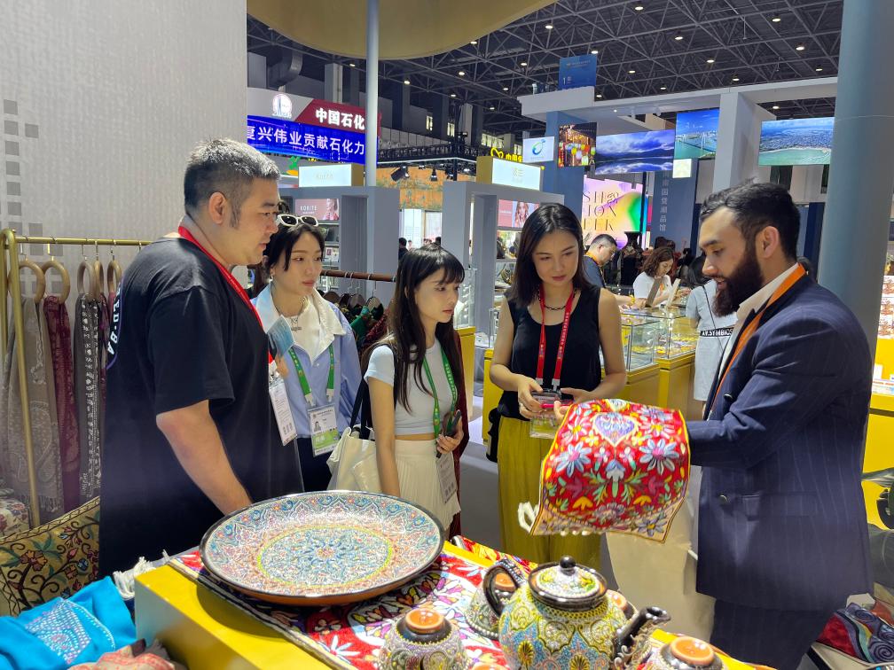 “這些都是我們的傳統(tǒng)手工藝品,上面的每個(gè)圖案都是獨(dú)一無(wú)二的。”操著一口標(biāo)準(zhǔn)流利的普通話介紹展品,烏茲別克斯坦參展商阿森貝克忙得不亦樂(lè)乎。