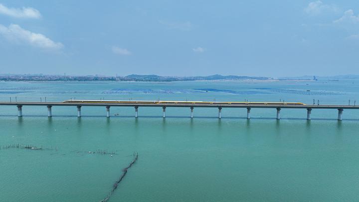 2023年6月28日,CR450動車組試驗列車在湄洲灣跨海大橋交會運行,單列最高運行時速達到453公里。(鐵科院集團公司供圖)