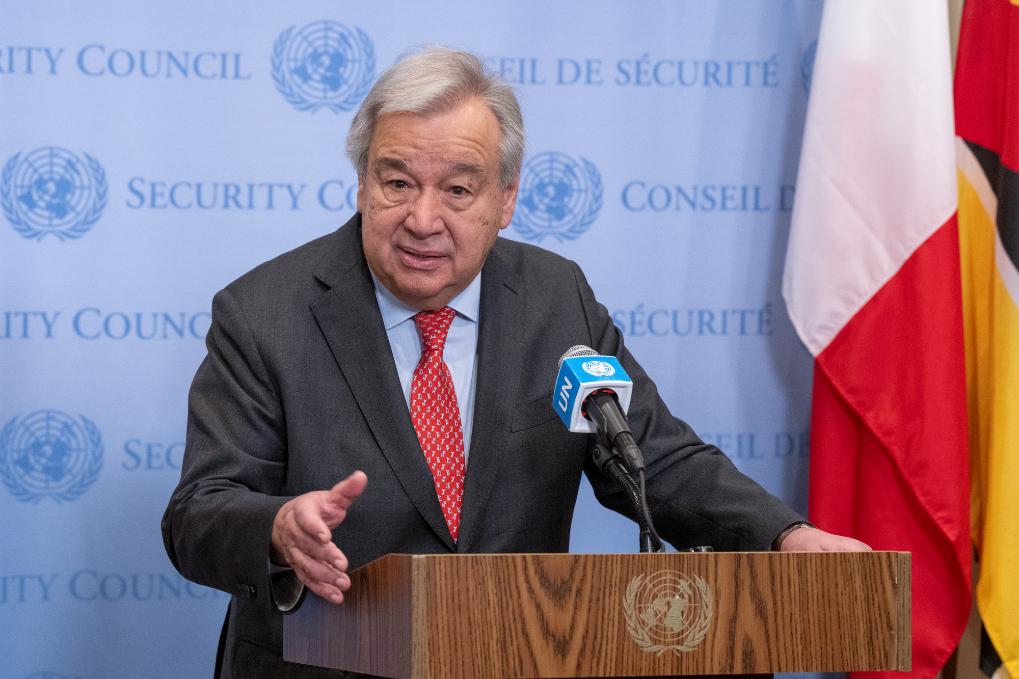 4月5日,在位于紐約的聯(lián)合國總部,聯(lián)合國秘書長古特雷斯舉行記者見面會。新華社發(fā)(聯(lián)合國供圖/埃瑟金德爾·德貝貝攝)