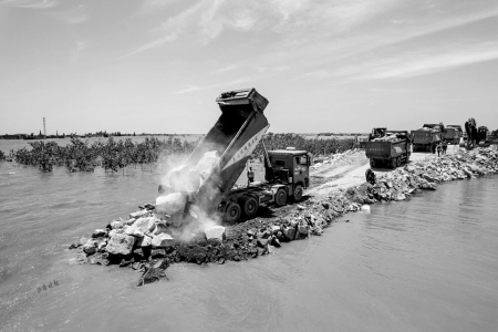 烈日高照,暑熱蒸騰,光禿禿的間堤上沒(méi)有任何遮擋物,陽(yáng)光暴曬大地。記者看到,許多消防隊(duì)員臉曬得黝黑,顧不上擦去額頭汗珠,手上的工作始終沒(méi)有停止。